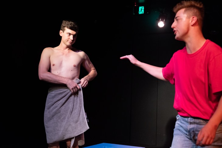 It’s a straight-forward concept for a script: all the different ways someone could identify themselves as gay whether to family, friends, co-workers, neighbours, partners, strangers, the list of relationships is endless. Like a series of sketches, the twelve cast members use brightly coloured boxes to loosely block out settings and situations before diving into the reveal. It’s a clever way of exposing how our society’s status quo causes direct harm to people who don’t fit within its assumptions and expectations. What was disappointing, however, was how overwhelmingly white, cisgender, and male these coming out vignettes were. Coming out is not an experience unique to white gay men and it would have been more representative of the LGBTQIA+ community to have a diverse range of stories included.