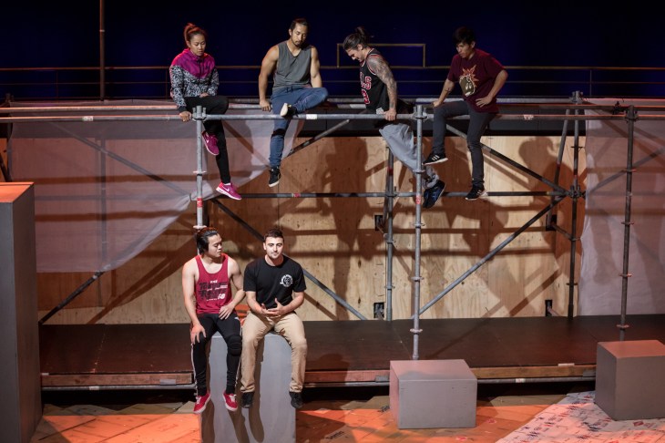 Combining tricking, b-boying, parkour, and acrobatics, the performers from Dauntless Movement Crew combine with PYT Fairfield and Force Majeure to show off years worth of training in more conventional martial arts before moving into their current performance forms. These styles turn mundane urban spaces into obstacle courses, jungle gyms, and backdrops for their impressive range of tricks and choreographies. This indoor production brings elements of these street spaces in the form of concrete-esque blocks, cardboard mats, and scaffolding for the performers to climb, jump, spin, and swing in all manner of directions.