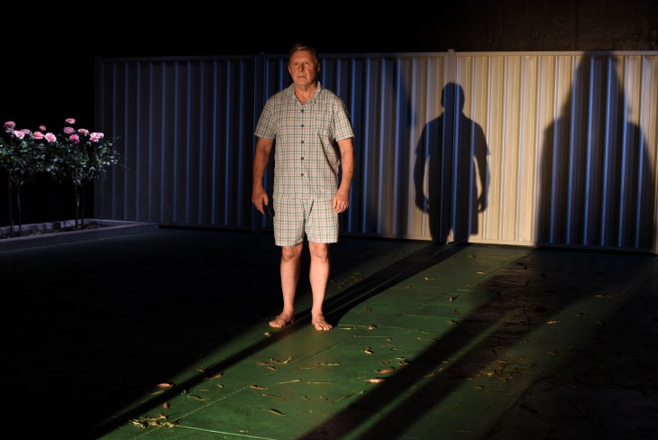 Set design from Stephen Curtis recreates the conventional Aussie backyard with green plastic garden furniture, corrugated iron fencing, a large square of cracked, worn concrete like an amphitheater stage on which life walks, and always framed with Bob’s steady rose garden. The big, empty space echoes with references to totem tennis games, family gatherings, and the events that shape a life. The lighting design by Damien Cooper uses contrasting tones of natural warm floor lights, like path night-lights, with moments of minimal cold overhead lighting to emphasise the heating and cooling atmosphere of the family’s dynamics. There is heavy shadowing throughout that feels dense and dramatic compared to the lightness in Alan John’s composition and Steve Francis’s sound design with flitting birds and lilting rhythms.