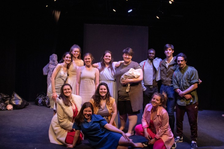 Director Maddison Huber plays around with classical Greek aesthetics in tableau framing and staging that incorporates varying levels between the chorus (Angelica Murdaca, Taleece Paki, and Shannon Rossiter), the royal family, and the prison camp guards. The pacing of the production is similarly classical with long monologues and a slow, but steady, forward movement. Set design from John Sullivan was simple, including piles of garbage bags surrounding Grecian statues, representing the dereliction of the great ancient city. The lighting and sound design from Aimee Raval and Lucy Mills lent into the inexplicable sci-fi elements of the production with flashing colours and whooshing noises reminiscent of old school Doctor Who or other depictions of time travel.