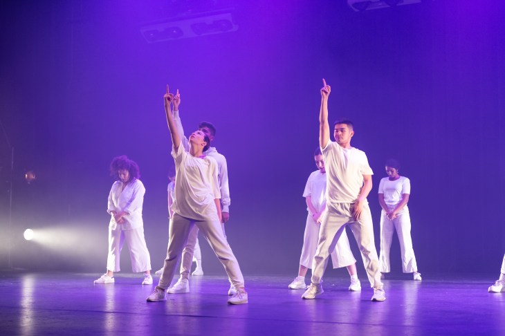 Other stand-out pieces included “Flickers”, choreographed by Sibel Alca, attempting to illustrate the experience of ageing with a group clad in natural fibres and making use of the many angles of the body: knees, elbows, feet, and ankles. Alice Gabir and Shankari Jeyaseelan’s piece titled “The Hustle” was a crowd favourite in its exploration of the experience of the children of immigrants set to “Lost in the World” by Kanye West and “Sunday Service (Remix)” by Denzel Curry. This piece had everyone in white, lit with a mix of colours and handheld flashlights while they danced in an energetic and dynamic celebration of their cultural identities. A brief tap number near the end, choreographed by Emily Zhong and Joshua Riley, was a simple but effective homage to the massive and minute forces of the universe with some excellent slides.