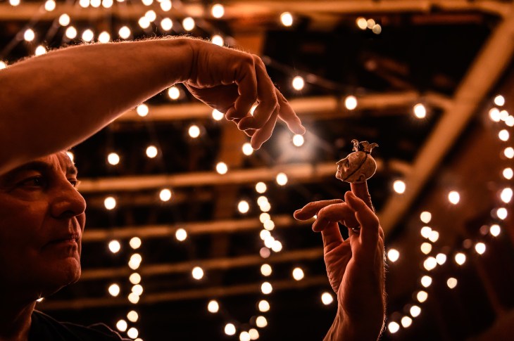 Once the audience has arrived and properly seated itself around the room of eclectic benches and chairs, Ronnie Burkett as the bard, the fool, the narrator, the puppeteer, and the star begins the proceedings. At once a collection of interlaced stories of love, the production is also an experience complete with a series of ceremonies the audience must undergo before the night is out. The first involves meeting your Other, a hand-puppet presented to you as your companion and alternate as you wander through the various worlds of Burkett’s creation.